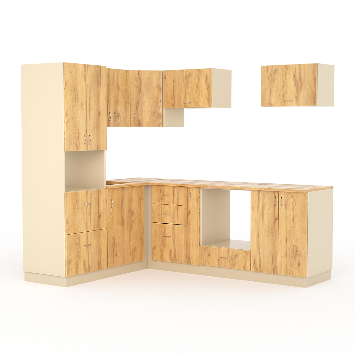 Кухонная гарнитура со столешницей — это комплект мебели для кухни, который включает в себя нижние и верхние шкафы, а также рабочую поверхность (столешницу). Размещается в углу. Столешница является важной частью кухонной гарнитуры, так как она служит рабочей поверхностью для приготовления пищи. Оборудование позволяет организовать пространство кухни, создать удобную рабочую зону и место для хранения посуды, продуктов и кухонных принадлежностей. Кухонная гарнитура используется для обустройства кухни в жилых домах, квартирах, офисах и других помещениях, где есть необходимость в приготовлении пищи.