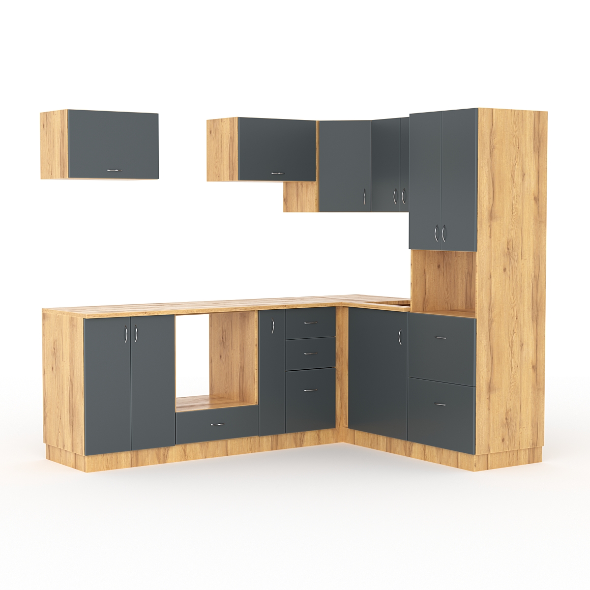 Система оснащена ящиками. Ящики в кухонной гарнитуре используются для хранения посуды, кухонных принадлежностей и других предметов, которые могут понадобиться при приготовлении пищи.