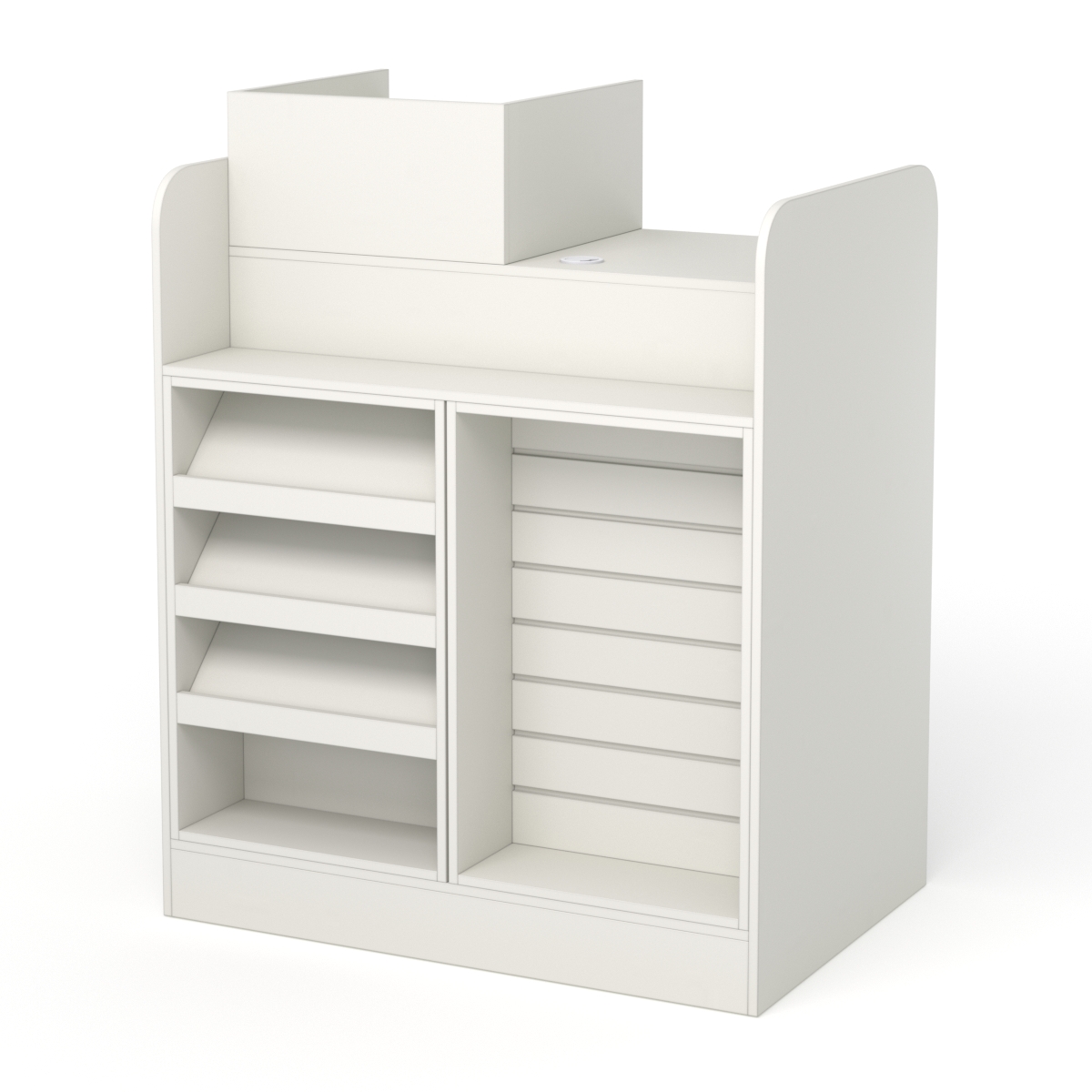 С внешней стороны кассовый стол оснащен экопанелью с кронштейнами, а также наклоненными полками, где можно разместить товары для спонтанных покупок.