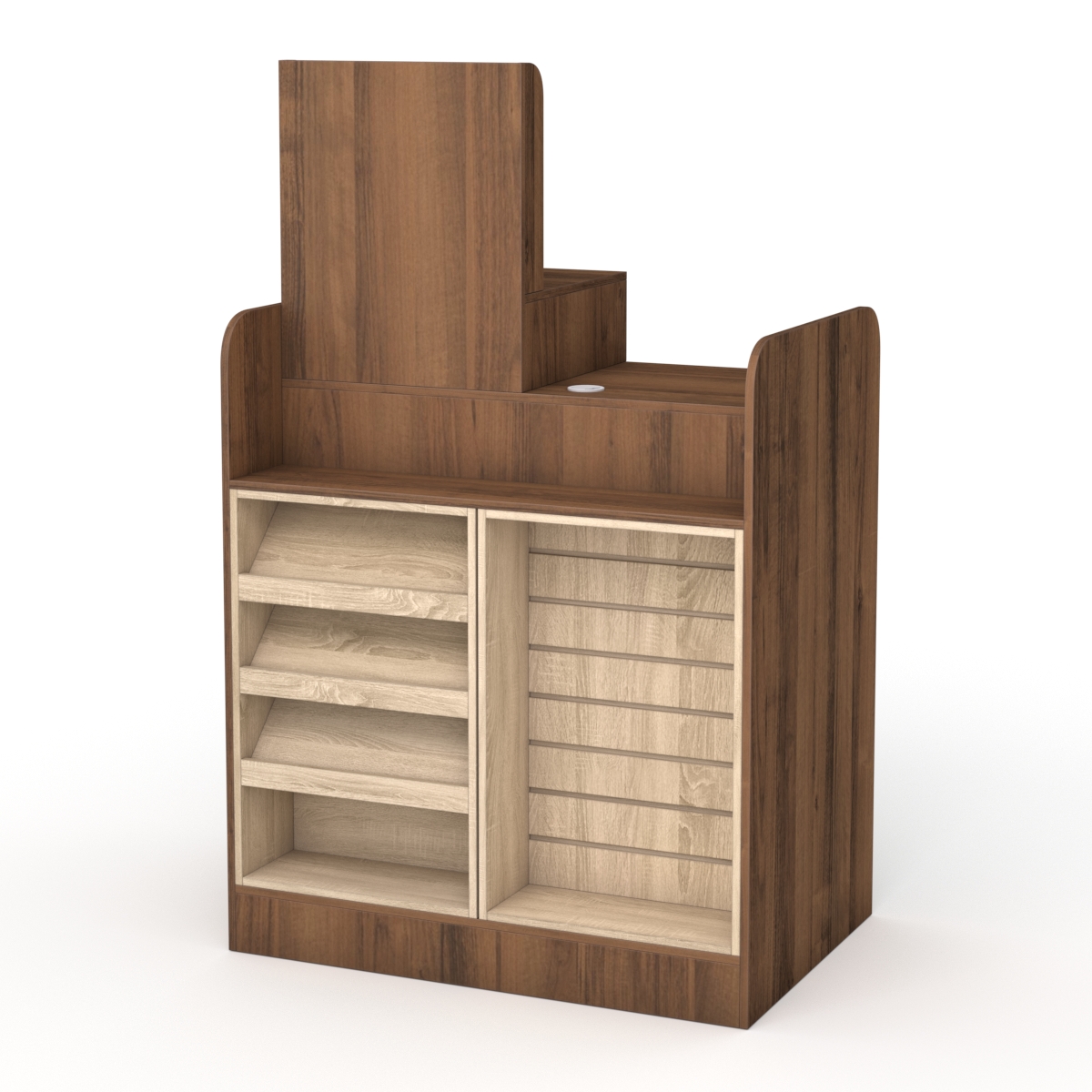 Со стороны кассира изделие оснащено четырьмя полками, где сотрудники могут складывать личные вещи или предметы, связанные с работой. Для кассового аппарата есть пространство, которое возвышается. Особенностью модели является то, что место для кассового аппарата оснащено большой перегородкой, из за которой не видно технику. Также конструкция предусматривает в столешнице заглушку для проводов.