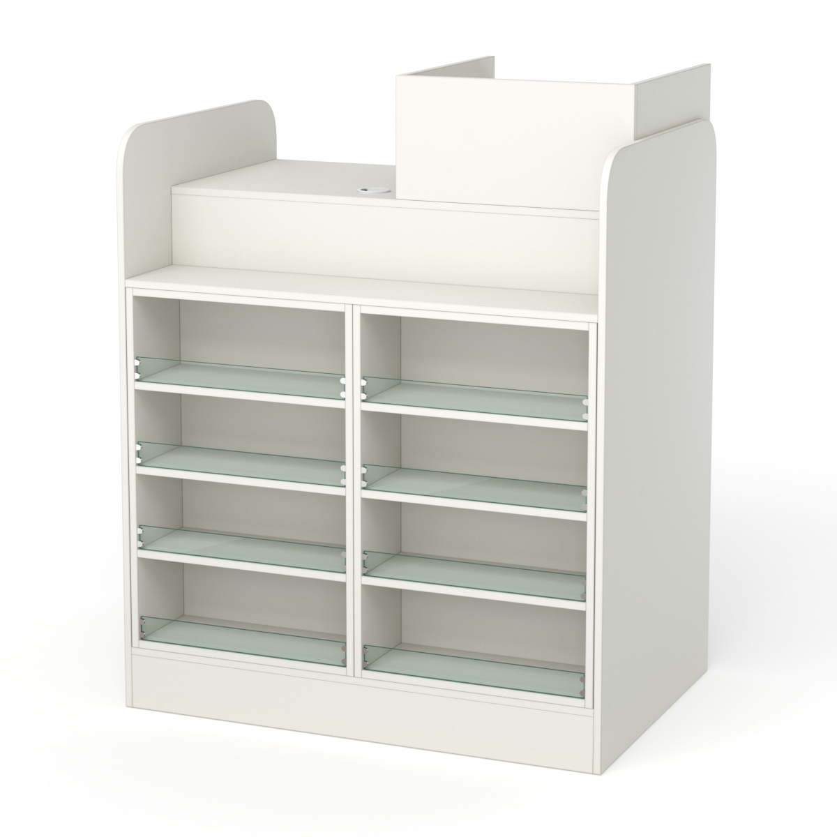 С внешней стороны кассовый стол оснащен восемью полками с стеклянными перегородками, где можно разместить товары для спонтанных покупок.