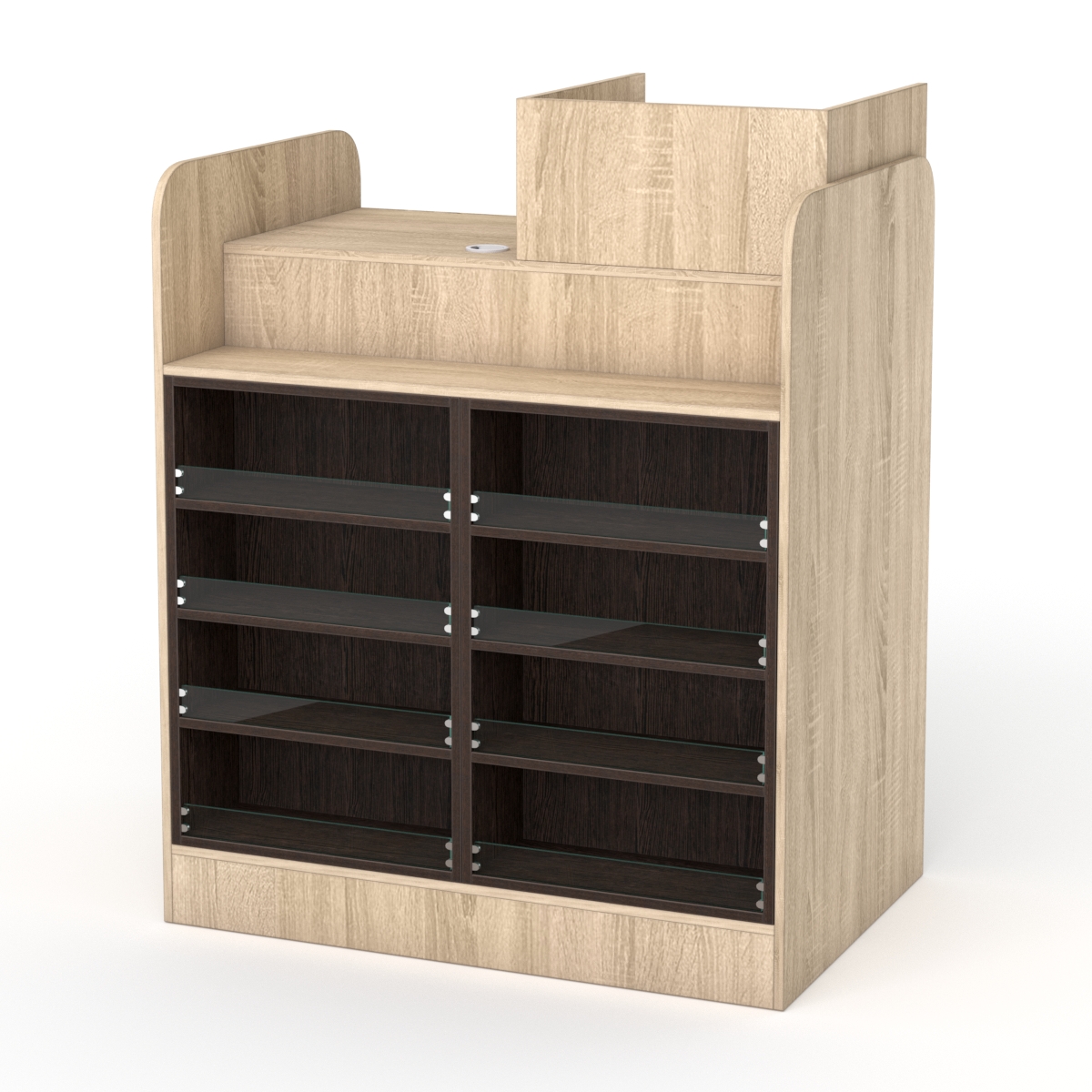 Со стороны кассира изделие оснащено четырьмя полками, где сотрудники могут складывать личные вещи или предметы, связанные с работой. Для кассового аппарата есть пространство, которое возвышается. Также конструкция предусматривает в столешнице заглушку для проводов.