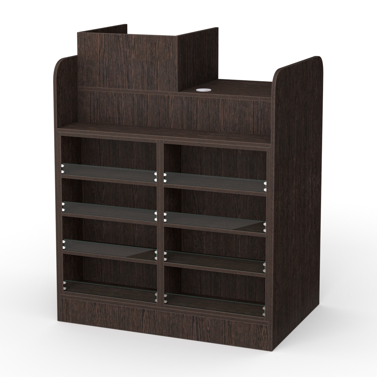 Каркас из ДСП. Имеет два отделения, в которых можно расположить бакалейную продукцию или канцтовары. Одно отделение представляет собой эконом-панель с крючками и стеклянной полкой. В другом отделении находится три наклонные полки.