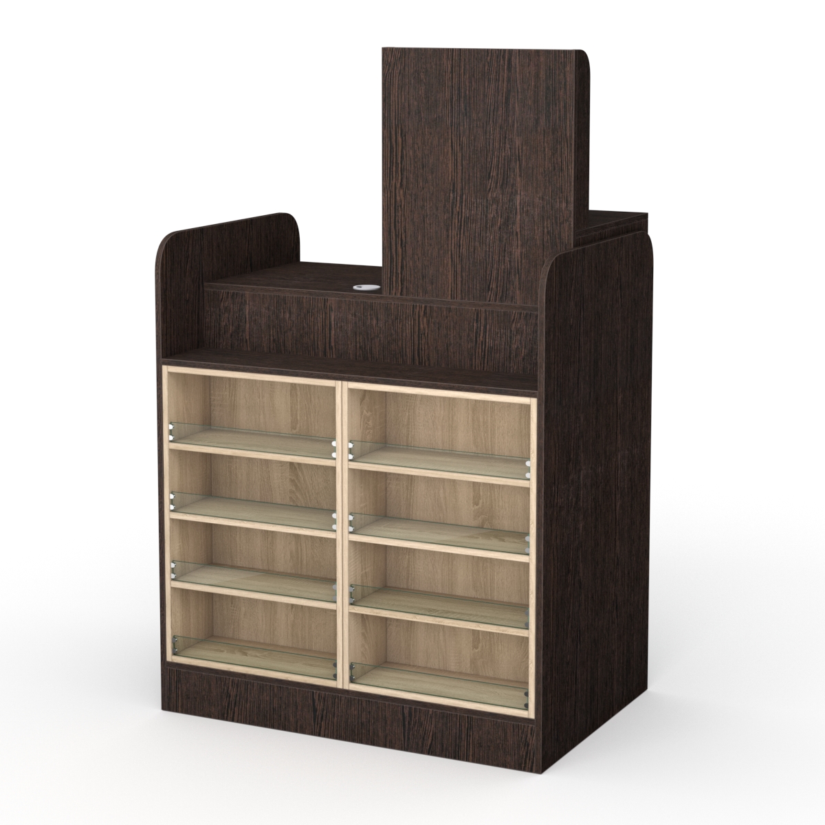 Со стороны кассира изделие оснащено четырьмя полками, где сотрудники могут складывать личные вещи или предметы, связанные с работой. Для кассового аппарата есть пространство, которое возвышается. Также конструкция предусматривает в столешнице заглушку для проводов.