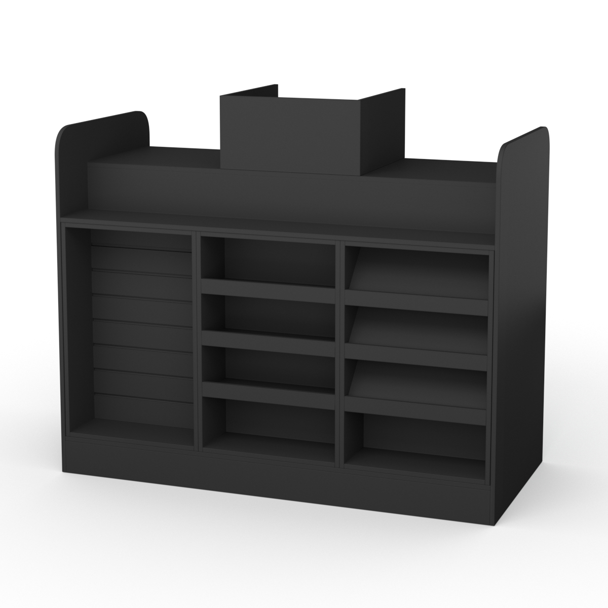 С внешней стороны кассовый стол оснащен экопанелью с кронштейнами, тремя горизонтальными полками, а также тремя наклоненными полками. На всех этих конструкциях можно разместить товары для спонтанных покупок.