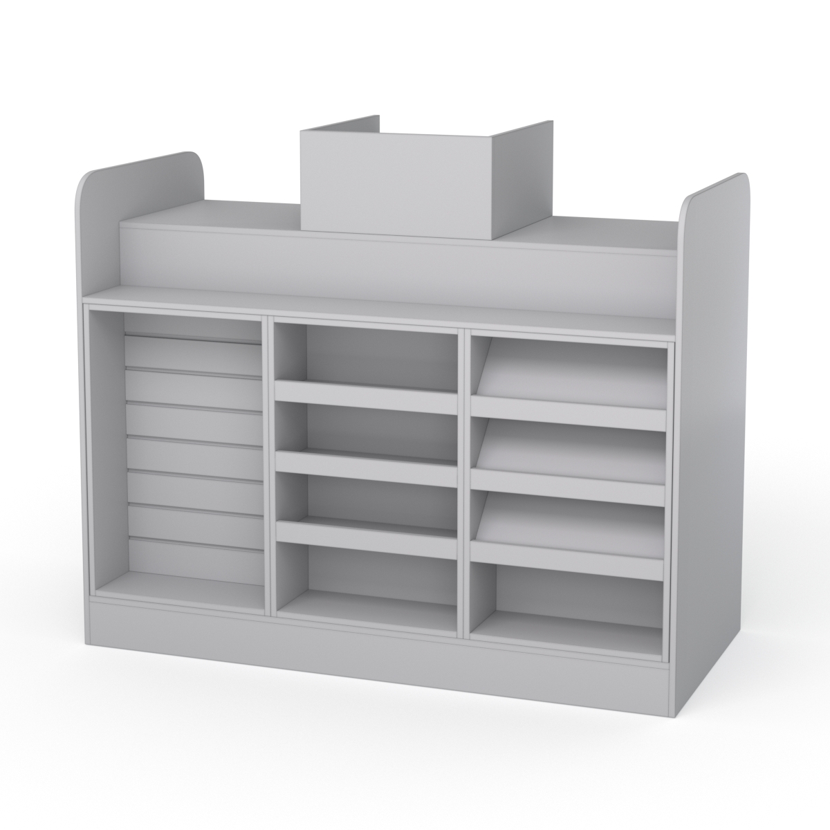С внешней стороны кассовый стол оснащен экопанелью с кронштейнами, тремя горизонтальными полками, а также тремя наклоненными полками. На всех этих конструкциях можно разместить товары для спонтанных покупок.
