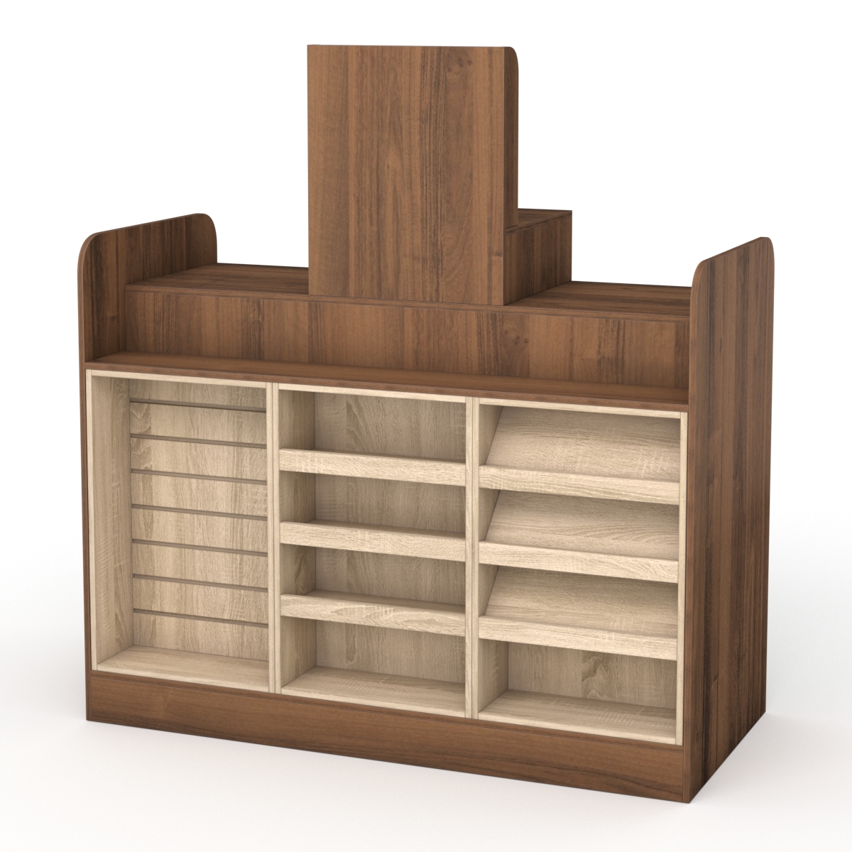 Со стороны кассира изделие оснащено семью полками, где сотрудники могут складывать личные вещи или предметы, связанные с работой. Для кассового аппарата есть пространство, которое возвышается посередине.