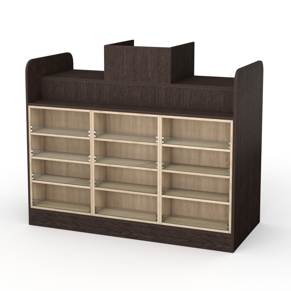 Со стороны кассира изделие оснащено семью полками, где сотрудники могут складывать личные вещи или предметы, связанные с работой. Для кассового аппарата есть пространство, которое возвышается посередине. Также конструкция предусматривает в столешнице заглушки для проводов.