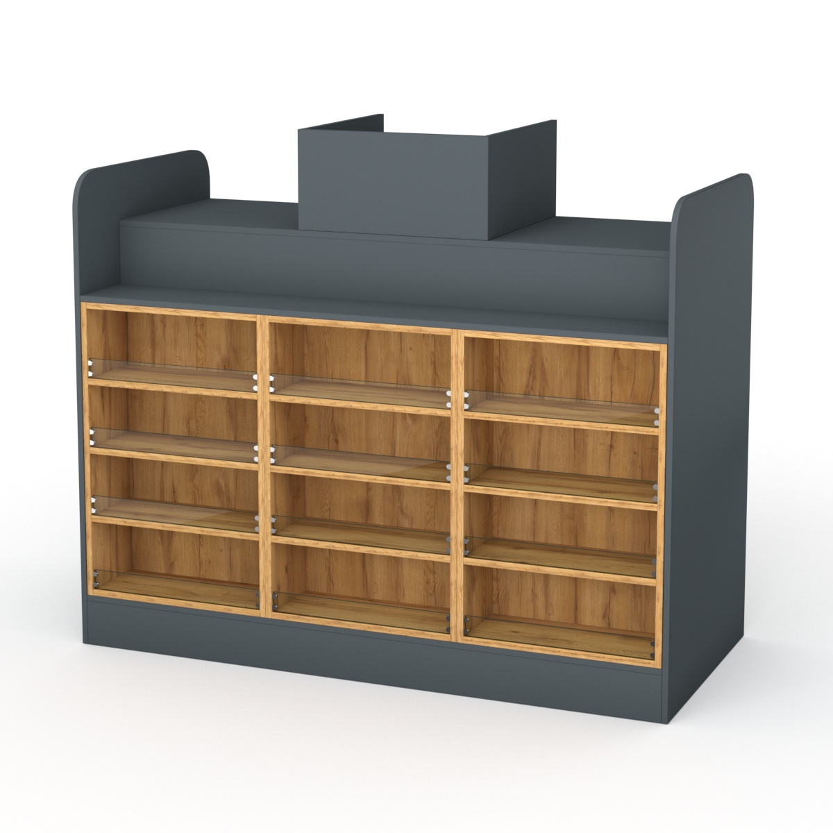 С внешней стороны кассовый стол оснащен двенадцатью полками со стеклянными перегородками, где можно разместить товары для спонтанных покупок.