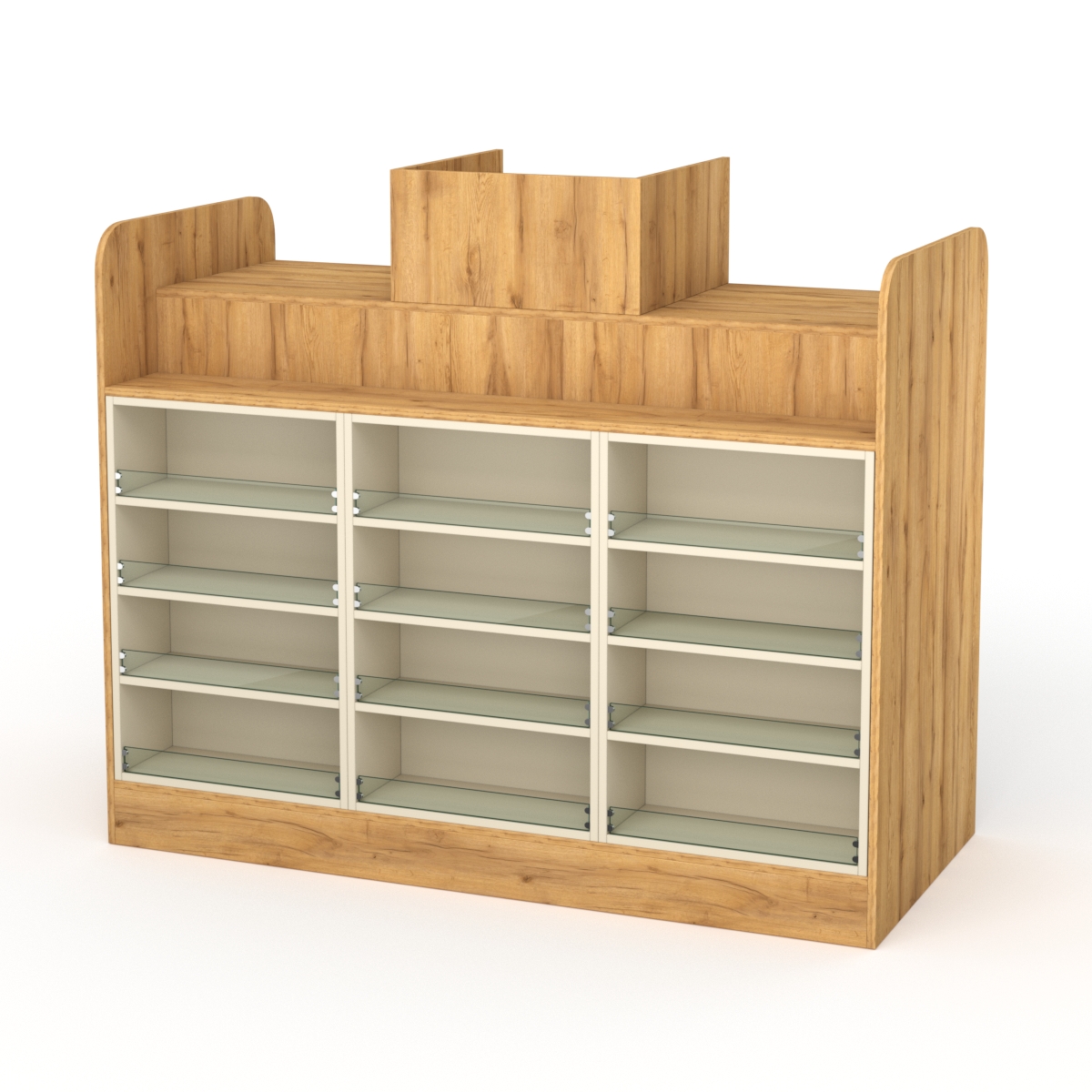 Со стороны кассира изделие оснащено семью полками, где сотрудники могут складывать личные вещи или предметы, связанные с работой. Для кассового аппарата есть пространство, которое возвышается посередине. Также конструкция предусматривает в столешнице заглушки для проводов.