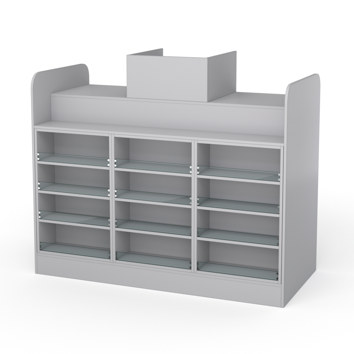 С внешней стороны кассовый стол оснащен двенадцатью полками со стеклянными перегородками, где можно разместить товары для спонтанных покупок.