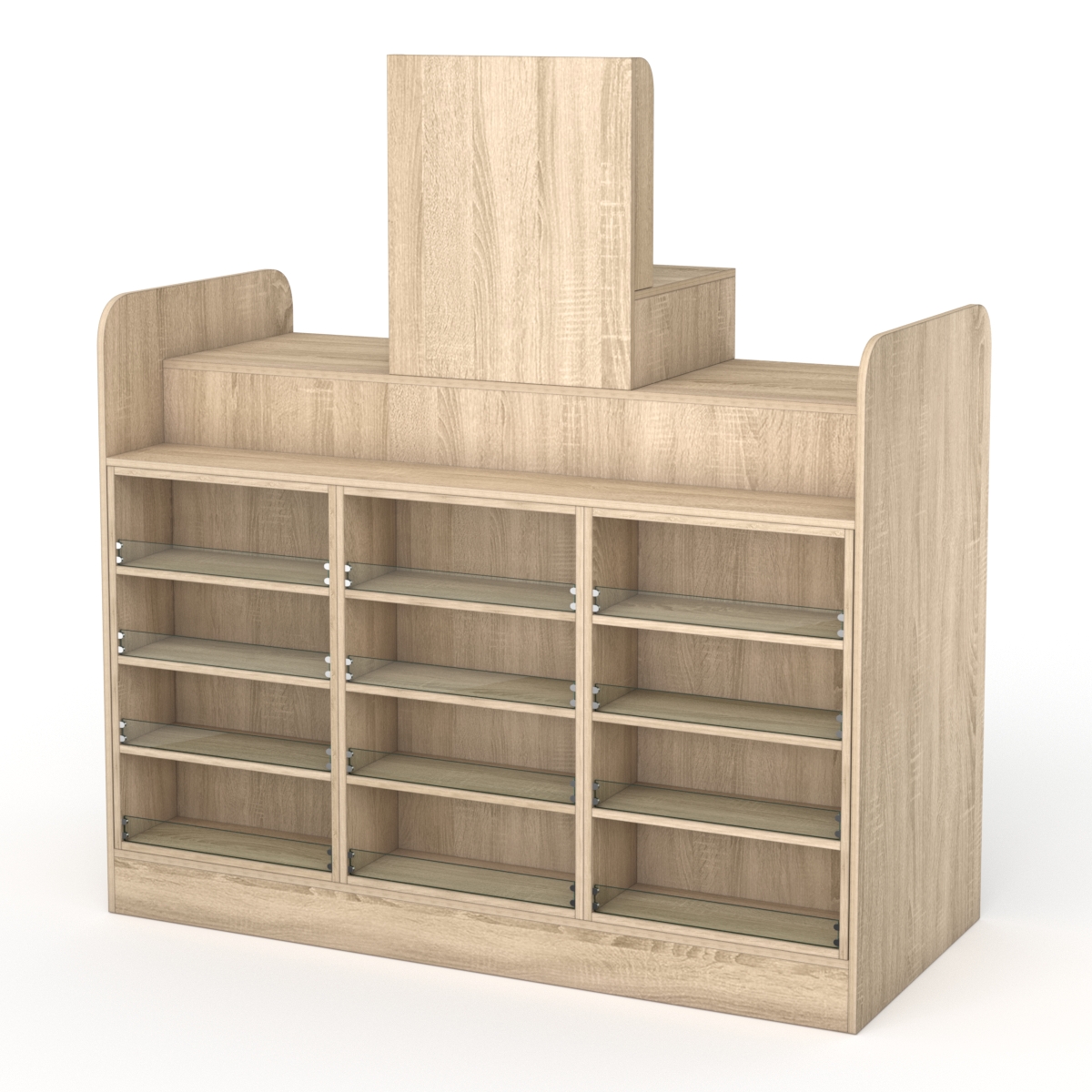 Со стороны кассира изделие оснащено семью полками, где сотрудники могут складывать личные вещи или предметы, связанные с работой. Для кассового аппарата есть пространство, которое возвышается посередине. Также конструкция предусматривает в столешнице заглушки для проводов.