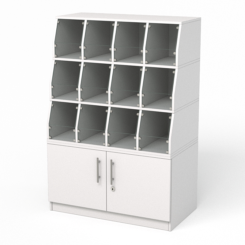 Стеллаж для конфет, орехов и сухофруктов — это конструкция, предназначенная для хранения и демонстрации этих продуктов в магазине. Имеется двенадцать полок для хранения продуктов. Материал — ЛДСП и стекло.