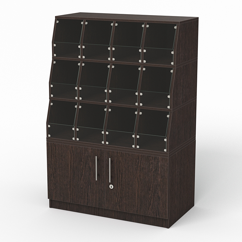 Стеллаж для конфет, орехов и сухофруктов — это конструкция, предназначенная для хранения и демонстрации этих продуктов в магазине. Имеется двенадцать полок для хранения продуктов. Материал — ЛДСП и стекло.