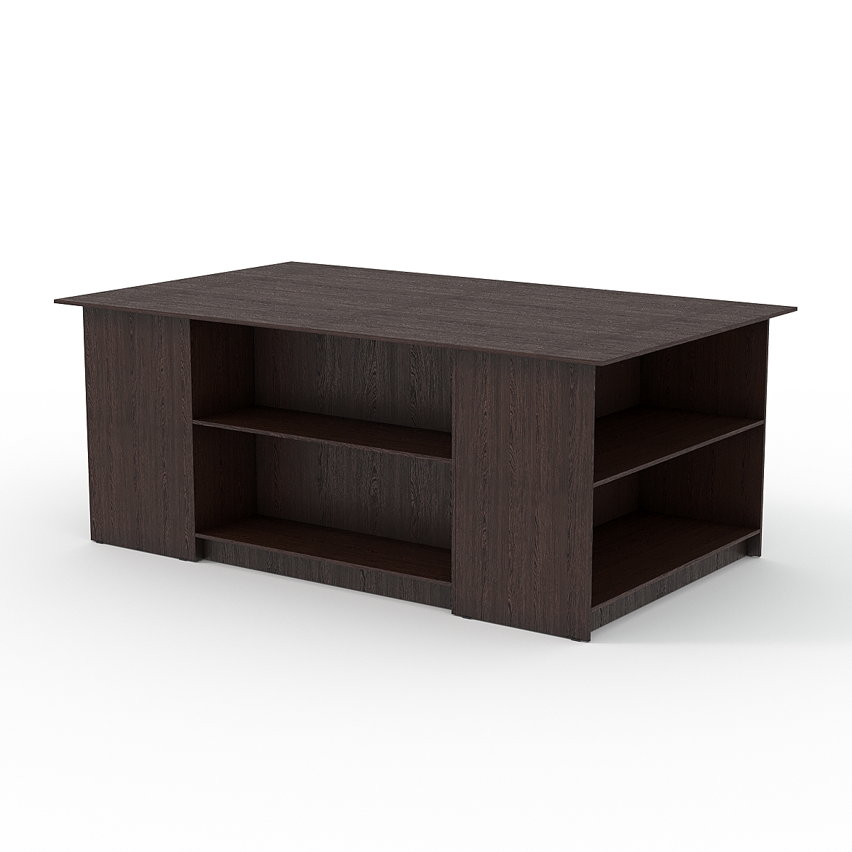Прочная устойчивая конструкция выполнена из ЛДСП. Стол имеет несколько отделений с полками, расположенные с разных сторон.