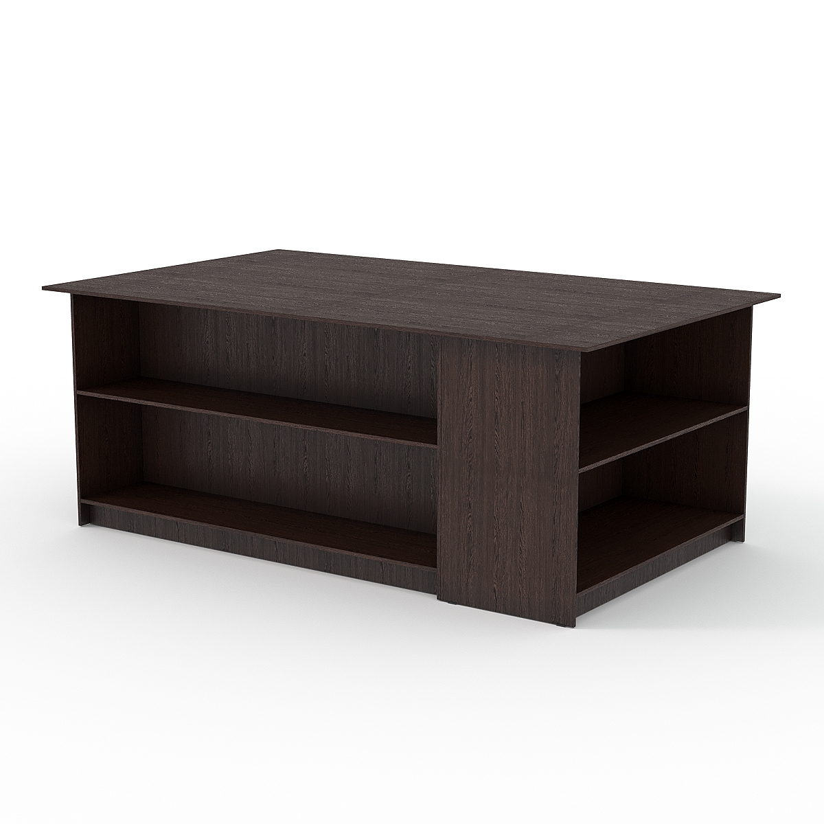Прочная устойчивая конструкция выполнена из ЛДСП. Стол имеет несколько отделений с полками, расположенные с разных сторон.