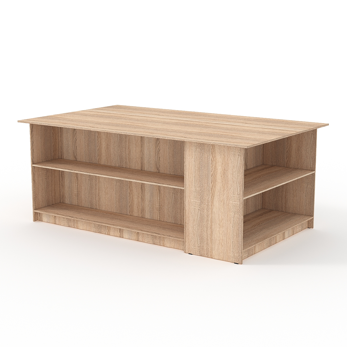 Прочная устойчивая конструкция выполнена из ЛДСП. Стол имеет несколько отделений с полками, расположенные с разных сторон.