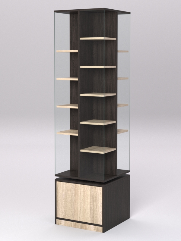 Конструкция выполнена из ЛДСП, передние ограничители полок — из стекла.
