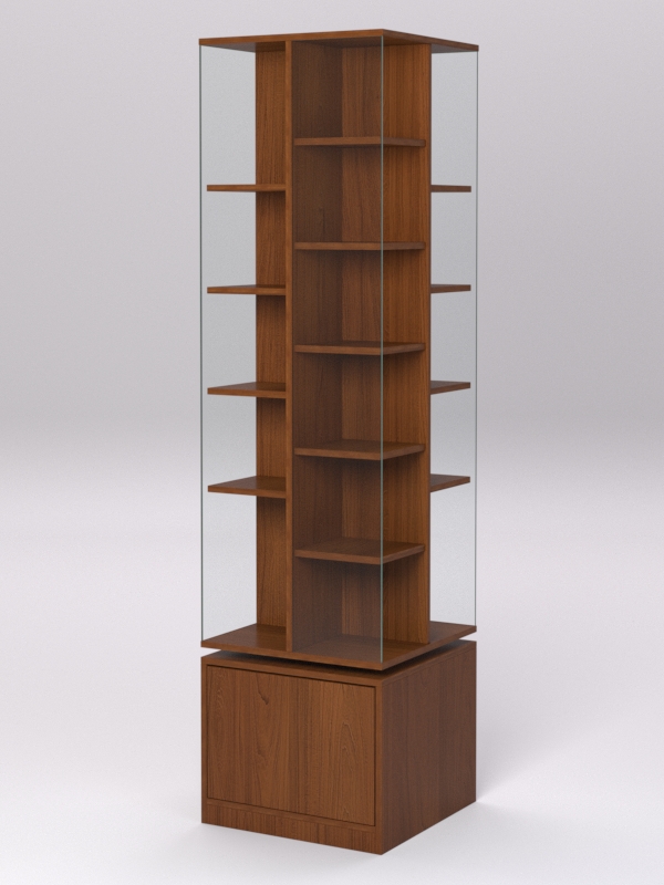 Конструкция выполнена из ЛДСП, передние ограничители полок — из стекла.