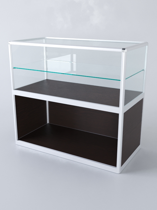Прилавок из профиля №3 (открытый) изготавливается из алюминиевого профиля с использованием заполнителей из МДФ и стекла. Верхняя половина прилавка — прозрачная. Прилавок комплектуется одной стеклянной полкой, которую можно регулировать по высоте. Все размеры, а также комплектация могут быть изменены по желанию заказчика. Возможно добавление полок.