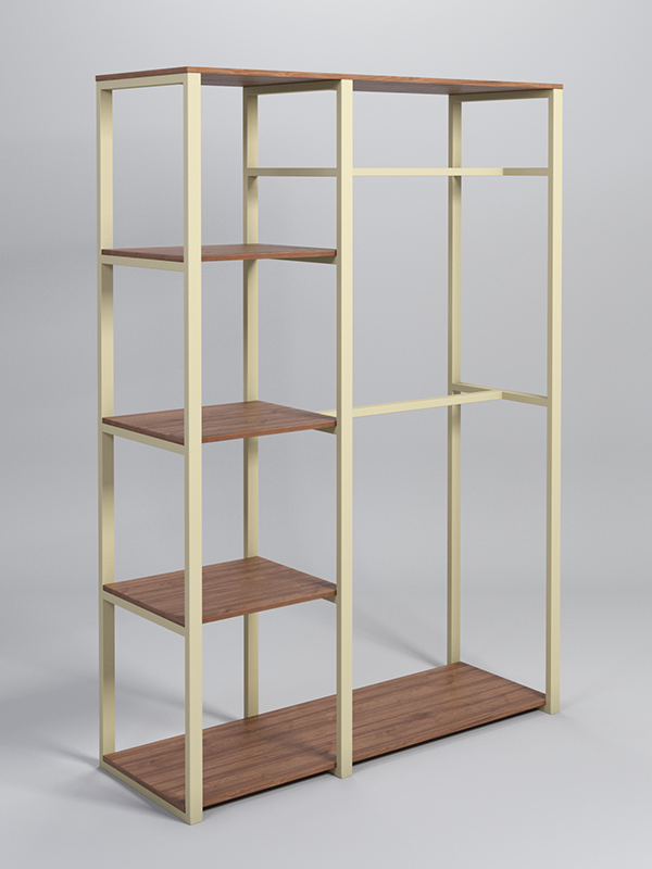 Данное изделие состоит из металлического каркаса, трех полок, которые можно заполнить различными предметами. будь то цветами, аксессуарами или предметами декора, и двух вешалок для одежды. А на поверхность внизу данной модели можно поставить различные коробки, корзины и обувь.