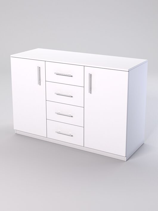 Тумба (2 распашные дверцы и 4 выдвижных ящика). Слева и справа секции с дверцами, посередине четыре выдвижных ящика. Широкая тумба отлично подойдет как под офисную технику, так и для хранения документов.