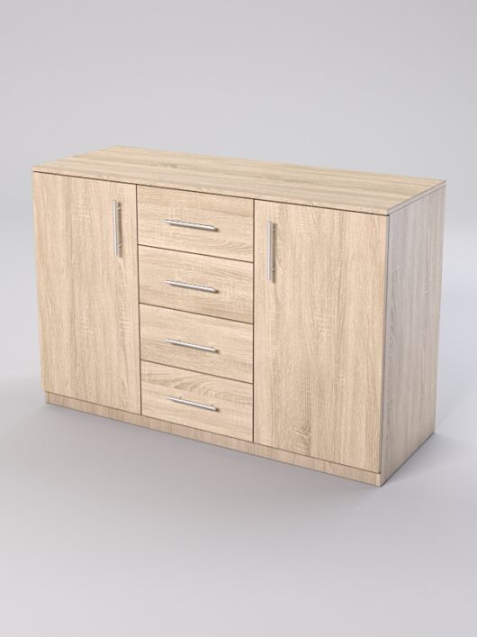 Тумба (2 распашные дверцы и 4 выдвижных ящика). Слева и справа секции с дверцами, посередине четыре выдвижных ящика. Широкая тумба отлично подойдет как под офисную технику, так и для хранения документов.