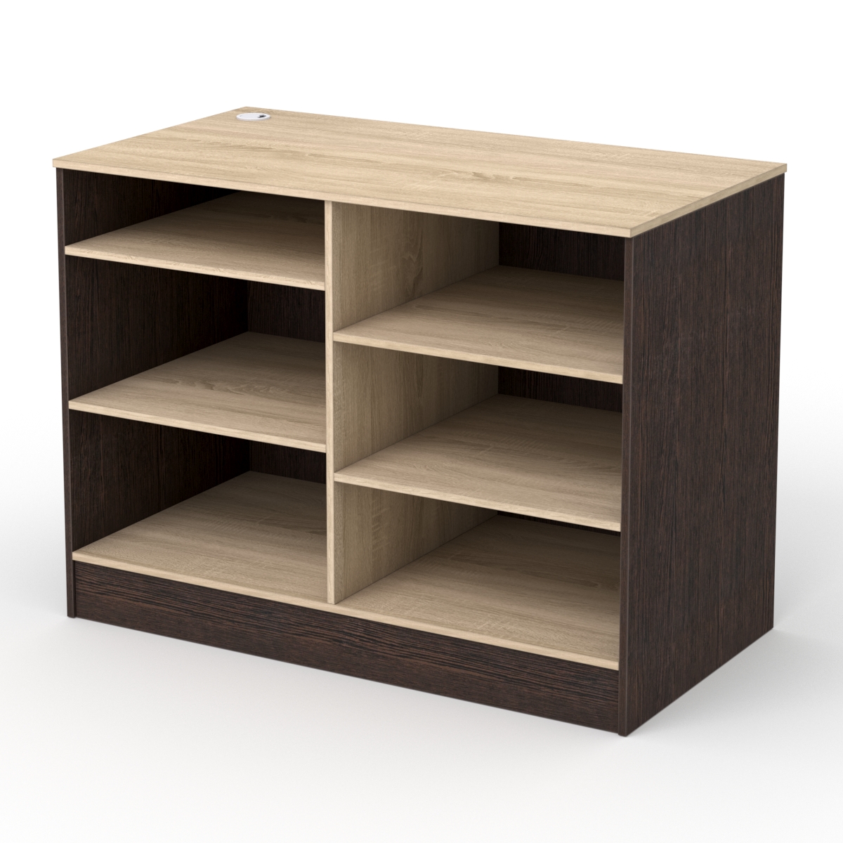 Со стороны кассира изделие оснащено четырьмя полками, где сотрудники могут складывать личные вещи или рабочие предметы. Полки расположены на разном уровне.