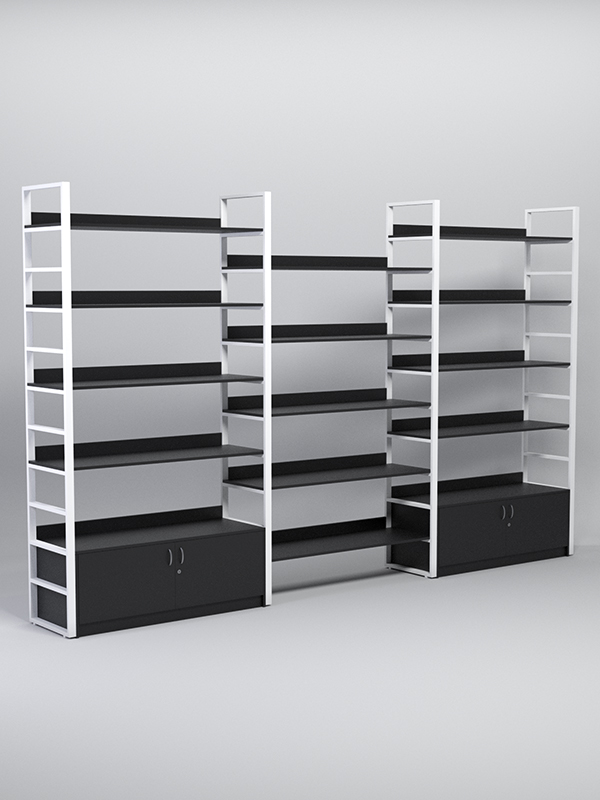 Комплект представляет собой сборную конструкцию из 2 основных модулей на 600 мм соединиенных комплектом полок (1280мм) . Габаритный размер стеллажной конструкции — 3760мм.