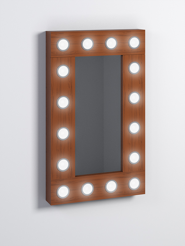 Гримерное зеркало. Крепится на стену. По форме прямоугольное. Зеркало оснащено лампочками. Подсветка от лампочек создаст освещение, которое поможет сделать качественный и идеальный макияж. Свет включается и выключается при помощи кнопки, расположенной сбоку. Зеркало подойдет для разных мест и случаев. Это отличный вариант в парикмахерскую, студию визажа или гримерную в театре. Помимо этого зеркало можно использовать дома, чтобы сделать макияж. Например, изделие прекрасно подойдет в спальнях или прихожих. Отлично сочетается с туалетными столиками.