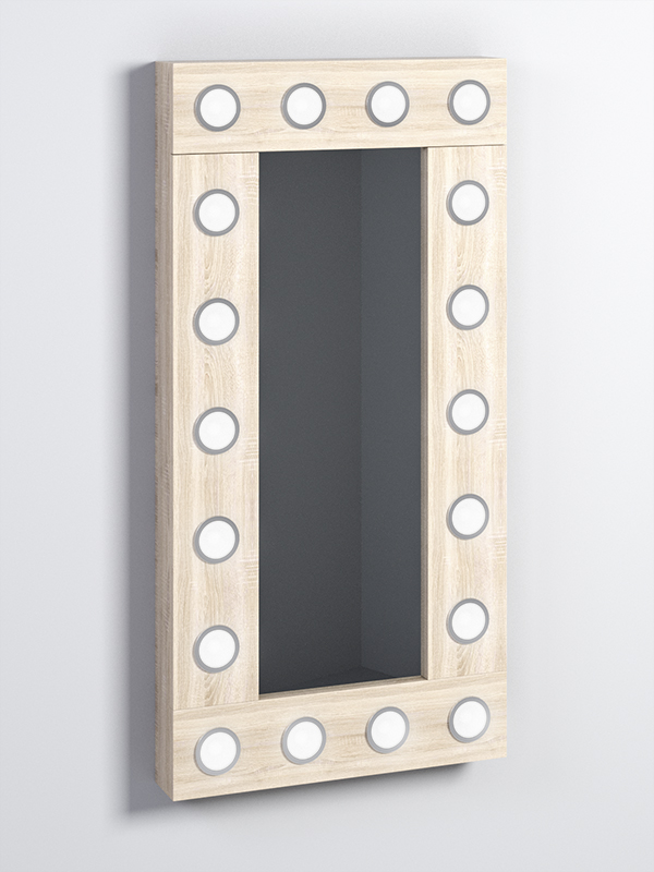 Гримерное зеркало. Крепится на стену. По форме прямоугольное. Зеркало оснащено лампочками. Подсветка от лампочек создаст освещение, которое поможет сделать качественный и идеальный макияж. Свет включается и выключается при помощи кнопки, расположенной сбоку. Зеркало подойдет для разных мест и случаев. Это отличный вариант в парикмахерскую, студию визажа или гримерную в театре. Помимо этого зеркало можно использовать дома, чтобы сделать макияж. Например, изделие прекрасно подойдет в спальнях или прихожих.