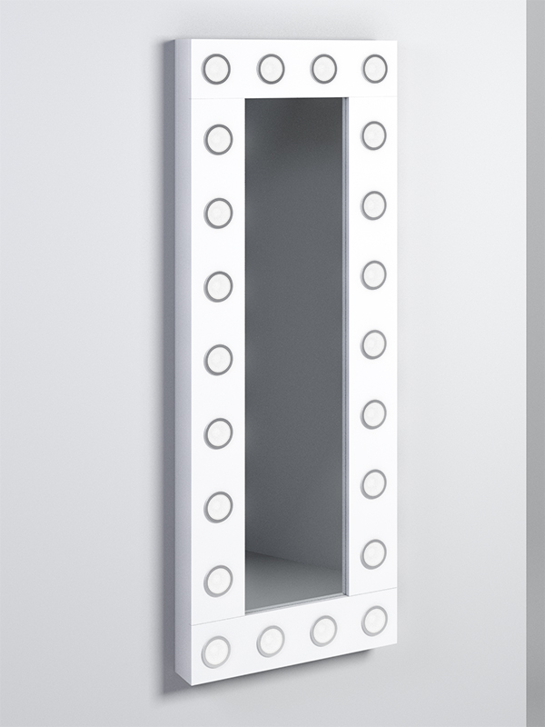 Гримерное зеркало. Крепится на стену. По форме похожа на вытянутый прямоугольник. Зеркало оснащено лампочками. Подсветка от лампочек создаст освещение, которое поможет сделать качественный и идеальный макияж. Свет включается и выключается при помощи кнопки, расположенной сбоку. Зеркало подойдет для разных мест и случаев. Это отличный вариант в парикмахерскую, студию визажа или гримерную в театре. Помимо этого зеркало можно использовать дома, чтобы сделать макияж. Например, изделие прекрасно подойдет в спальнях или прихожих.