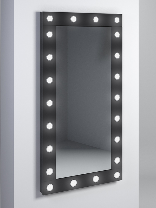 Гримерное зеркало. Крепится на стену. По форме изделие похоже на прямоугольник. Модель отличается большим зеркалом. Рама оснащена лампочками. Подсветка от лампочек создаст освещение, которое поможет сделать качественный и идеальный макияж. Свет включается и выключается при помощи кнопки, расположенной сбоку. Зеркало подойдет для разных мест и случаев. Это отличный вариант в парикмахерскую, студию визажа или гримерную в театре. Помимо этого зеркало можно использовать дома, чтобы сделать макияж в комфортных условиях. Изделие прекрасно подойдет в спальнях или прихожих.