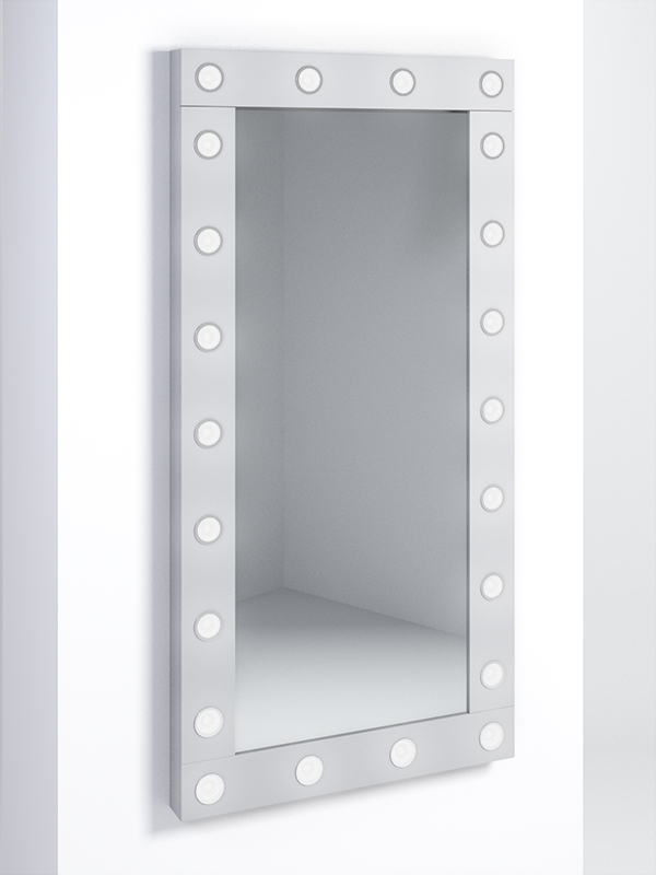 Гримерное зеркало. Крепится на стену. По форме изделие похоже на прямоугольник. Модель отличается большим зеркалом. Рама оснащена лампочками. Подсветка от лампочек создаст освещение, которое поможет сделать качественный и идеальный макияж. Свет включается и выключается при помощи кнопки, расположенной сбоку. Зеркало подойдет для разных мест и случаев. Это отличный вариант в парикмахерскую, студию визажа или гримерную в театре. Помимо этого зеркало можно использовать дома, чтобы сделать макияж в комфортных условиях. Изделие прекрасно подойдет в спальнях или прихожих.