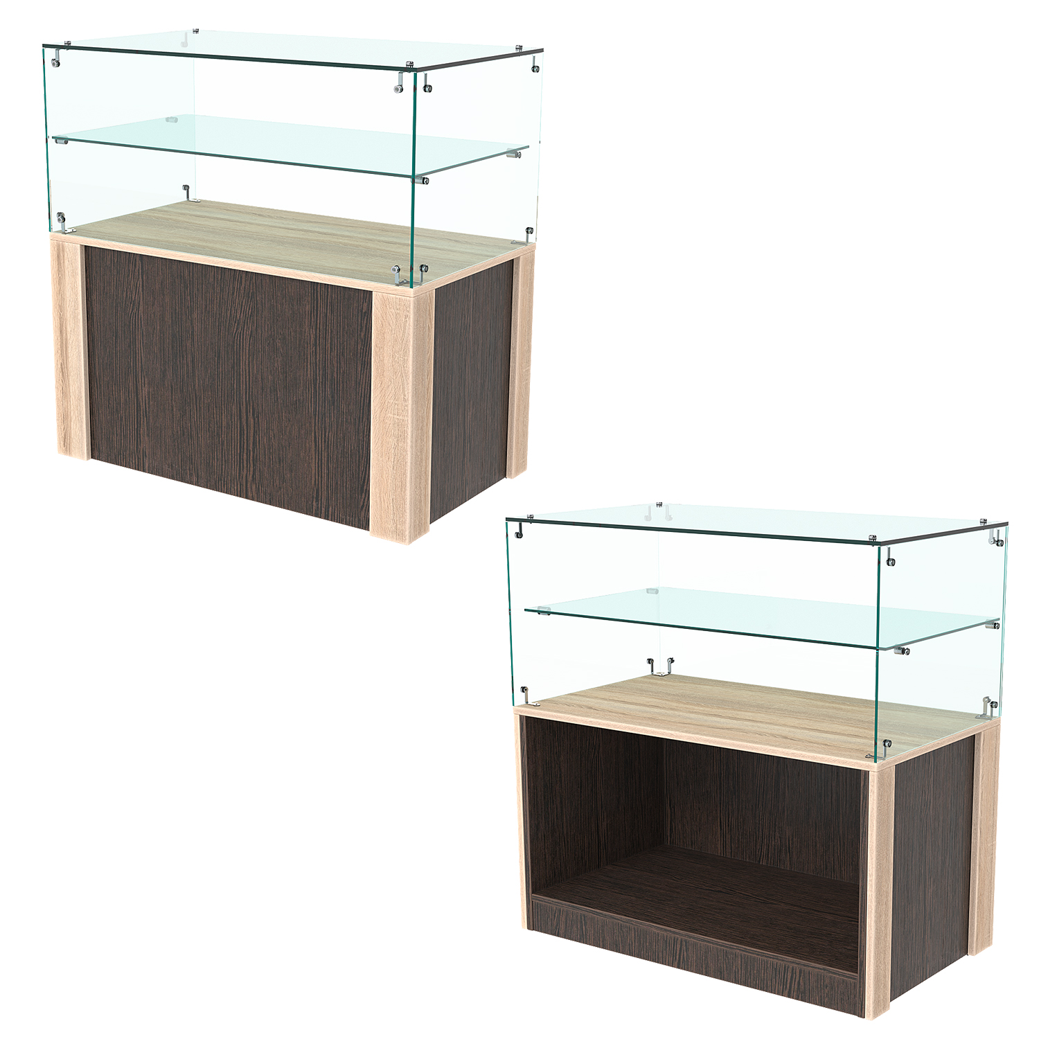 Прилавок имеет закрытый фасад и двухъярусный остекленный верх без задней стенки. Со стороны продавца прилавок открыт. Внутри модели имеется одна просторная ниша.