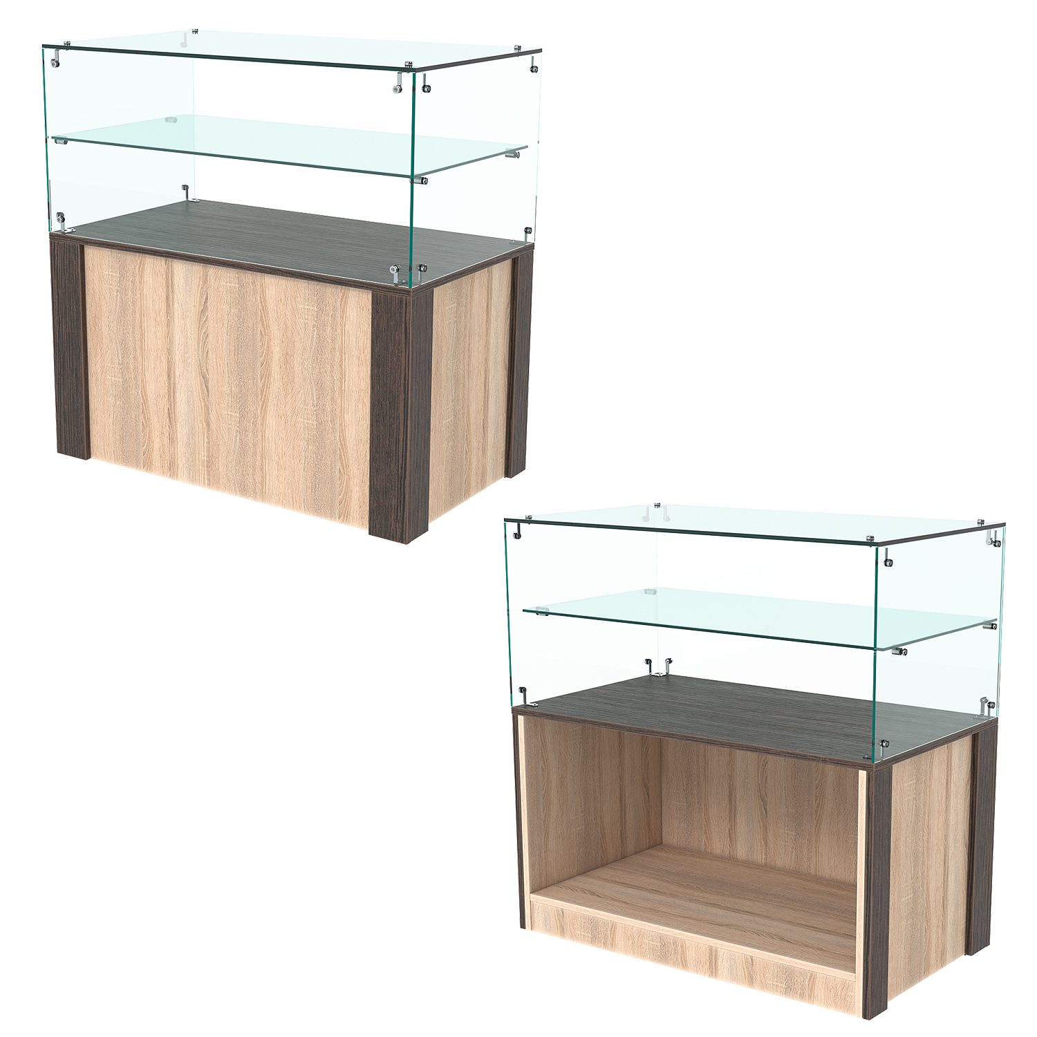 Прилавок имеет закрытый фасад и двухъярусный остекленный верх без задней стенки. Со стороны продавца прилавок открыт. Внутри модели имеется одна просторная ниша.