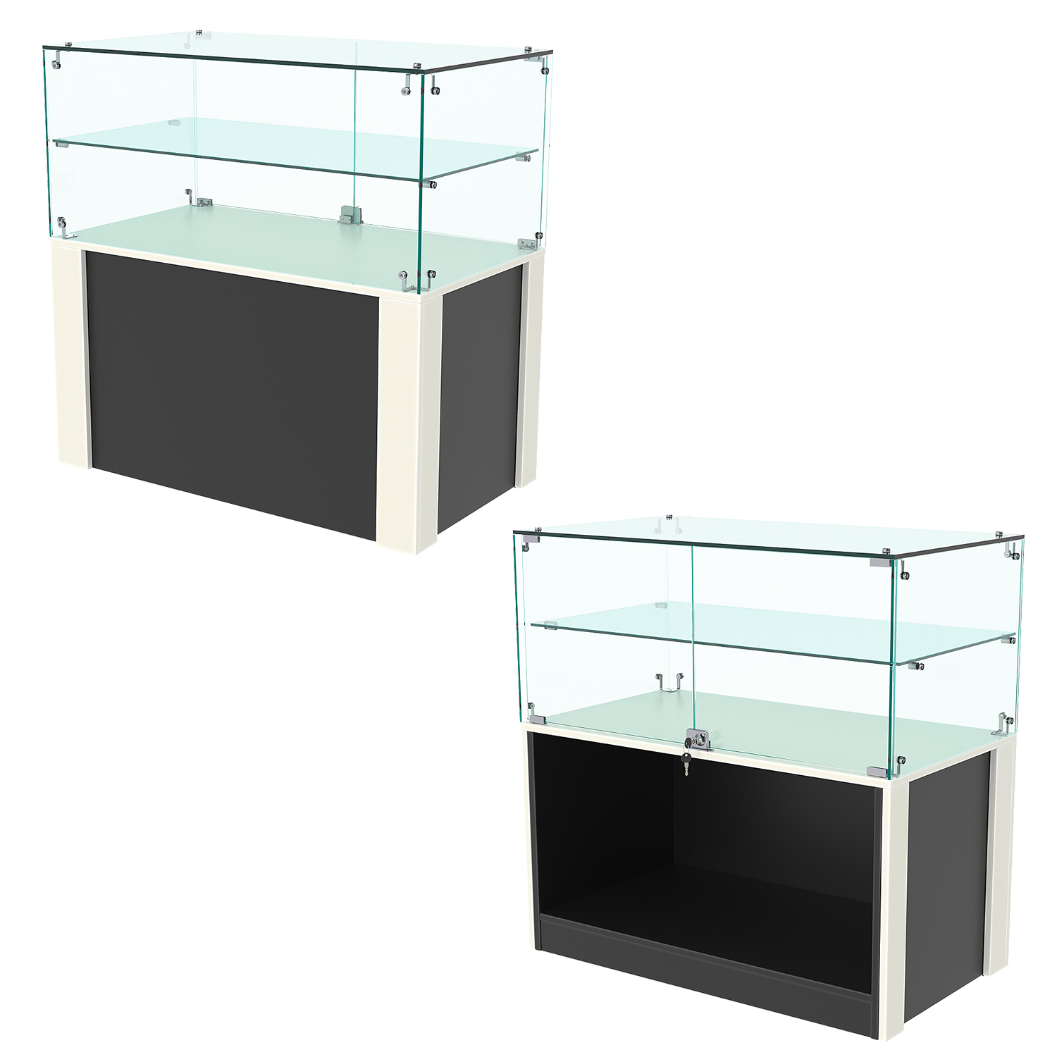 Прилавок имеет закрытый фасад и двухъярусный остекленный верх с дверцами. Со стороны продавца прилавок открыт. Внутри модели имеется одна просторная ниша.