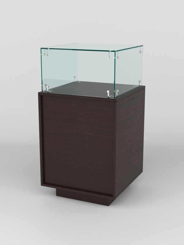 Конструкция включает четыре стеклянные полки и подиум. Корпус оборудован распашными дверцами с замком. В верхнем фризе имеется подсветка.