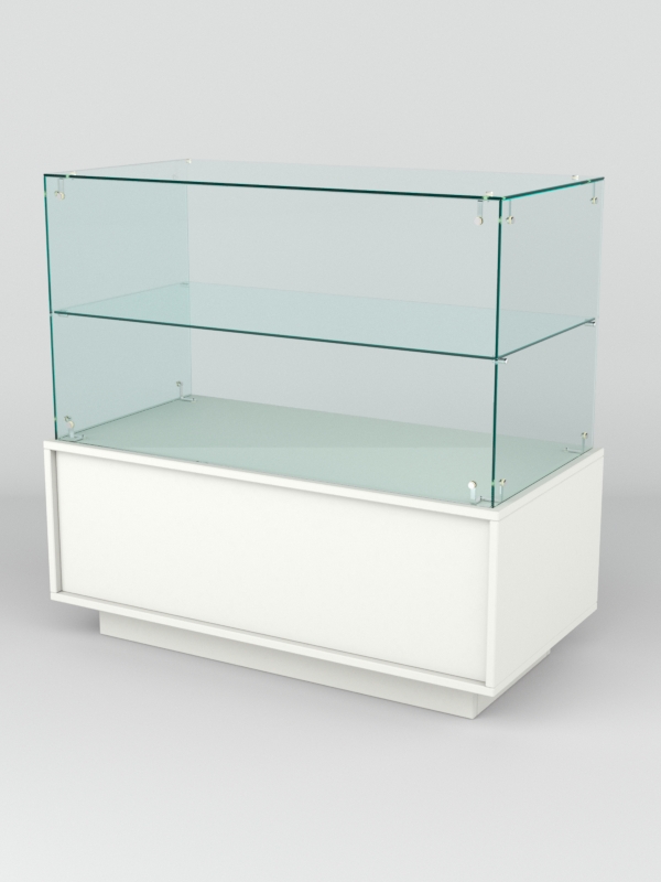 Прилавок имеет закрытый фасад и двухъярусный остекленный верх без задней стенки. Со стороны продавца прилавок открыт. Внутри модели имеется одна просторная ниша.