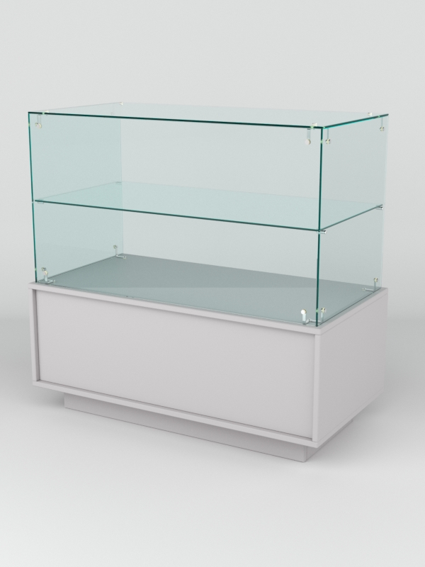 Прилавок имеет закрытый фасад и двухъярусный остекленный верх без задней стенки. Со стороны продавца прилавок открыт. Внутри модели имеется одна просторная ниша.