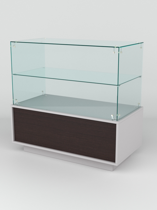 Прилавок имеет закрытый фасад и двухъярусный остекленный верх без задней стенки. Со стороны продавца прилавок открыт. Внутри модели имеется одна просторная ниша.