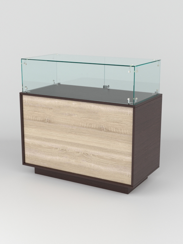 Прилавок имеет закрытый фасад и остекленный верх с двумя дверцами. Со стороны продавца прилавок открыт. Внутри модели имеется одна просторная полка.