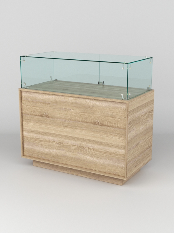 Прилавок имеет закрытый фасад и остекленный верх с двумя дверцами. Со стороны продавца прилавок открыт. Внутри модели имеется одна просторная полка.