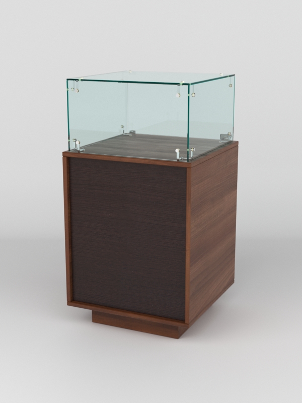 Конструкция включает четыре стеклянные полки и подиум. Корпус оборудован распашными дверцами с замком. В верхнем фризе имеется подсветка.
