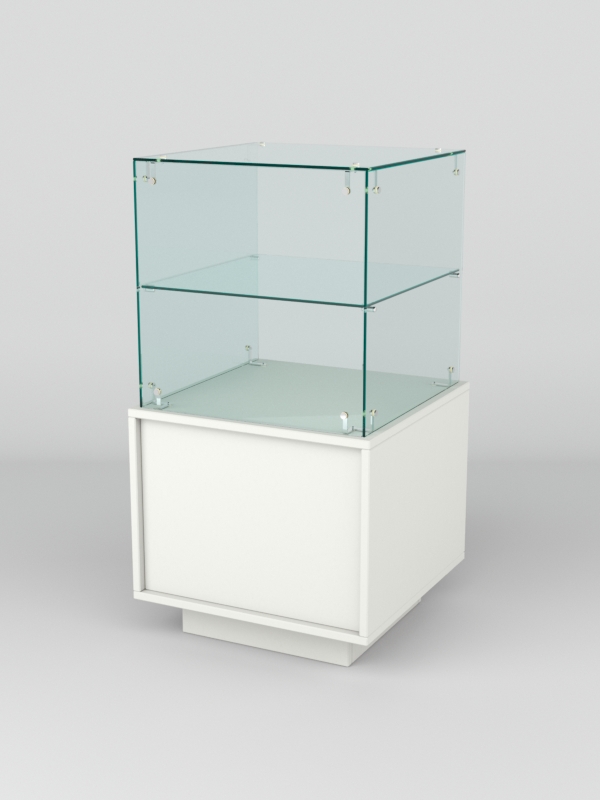Прилавок имеет закрытый фасад и двухъярусный остекленный верх без задней стенки. Со стороны продавца прилавок открыт. Внутри модели имеется одна просторная ниша.