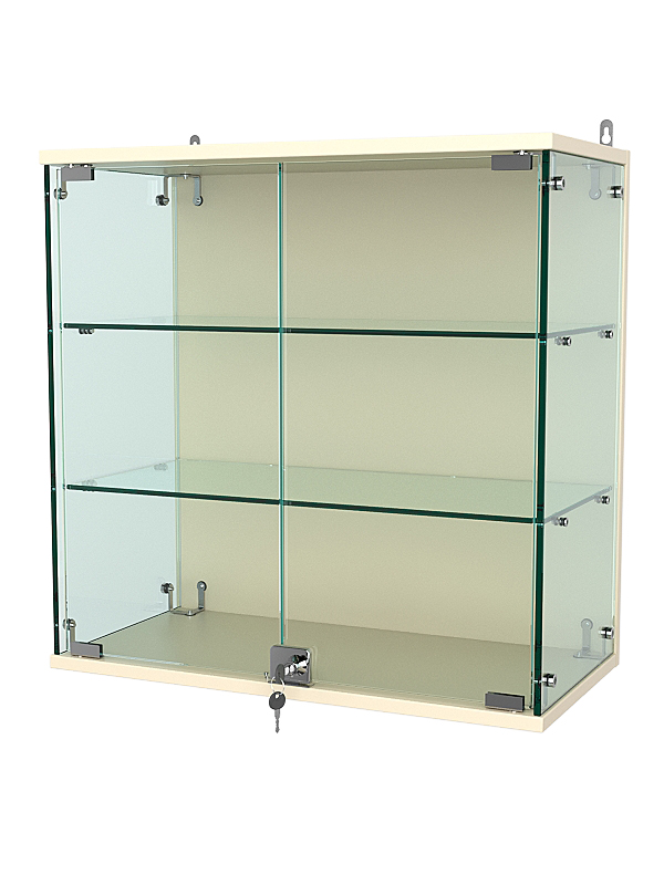 Данная модель включает две стеклянные полки и дверки, закрывающиеся на ключ.