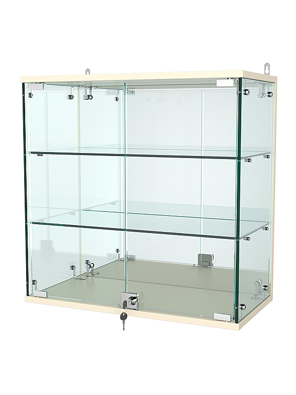Данная модель включает две стеклянные полки и распашные дверки, закрывающиеся на ключ. Отличительная деталь — зеркальная задняя панель, позволяющая рассмотреть товар со всех сторон.