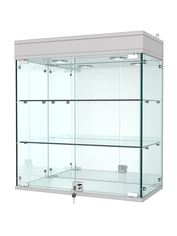 Данная модель включает две стеклянные полки и распашные дверки, закрывающиеся на ключ. Отличительная деталь — зеркальная задняя панель, позволяющая рассмотреть товар со всех сторон. Верхняя подсветка делает витрину ярче, а ее содержимое — заметнее.
