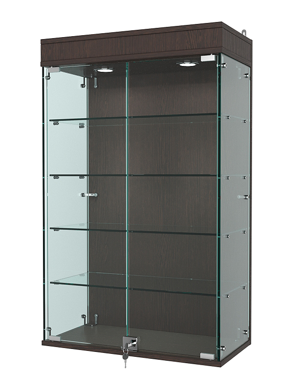 Данная модель включает четыре стеклянные полки и распашные дверки, закрывающиеся на ключ. Верхняя подсветка делает витрину ярче, а ее содержимое — заметнее.