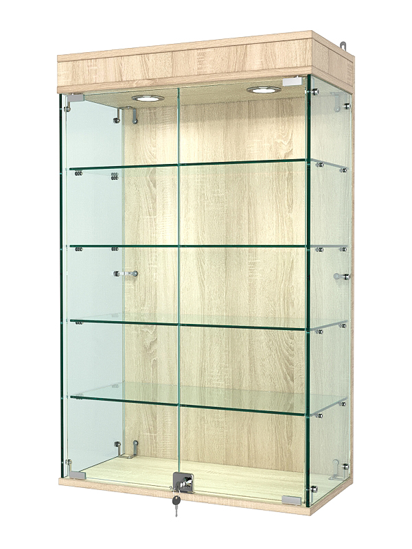 Данная модель включает четыре стеклянные полки и распашные дверки, закрывающиеся на ключ. Верхняя подсветка делает витрину ярче, а ее содержимое — заметнее.